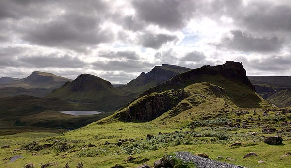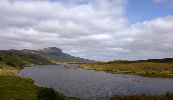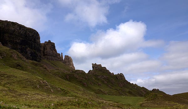 Further up, more Skye scenery! We are now in the northern part of Skye, past Portree. The skyline is decorated by the Cuillin, a range of volcanic rock formations. The most famous features are Storr and the Old Man of Storr. Of course, sheep also dot the landscape, grazing on the lush terrain.