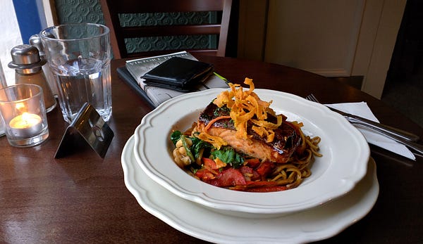 After a short walk and some exploration, I sat down at a restaurant that served a surprisingly good Scottish salmon filet. I’d love to claim that I walked into it serendipitously without attempting to look places up, but the reality is there simply isn’t good enough data and review coverage in this part of the world. I was recommended to this place by the hostel reception.